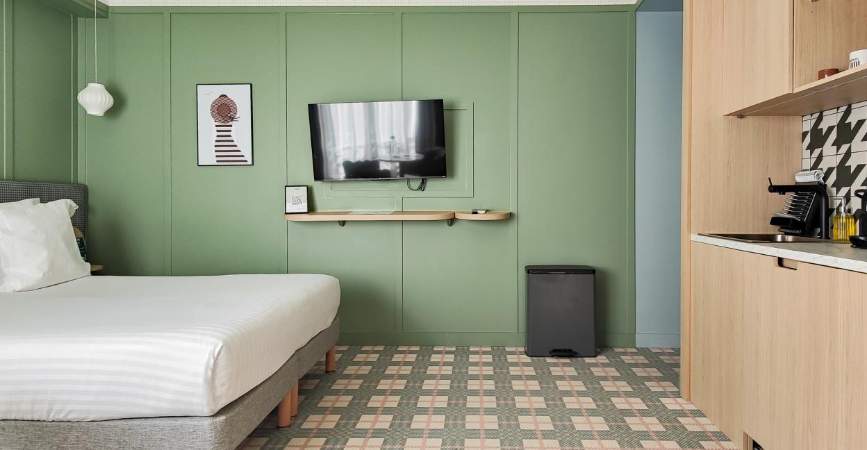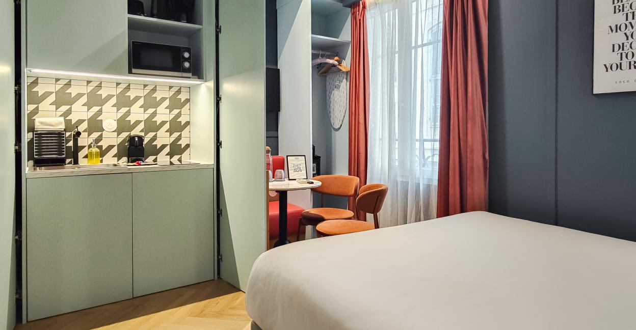 Le Petit Studio Standard est idéal pour accueillir un couple, un voyageur ou une voyageuse seul(e). Profitez d’un grand lit double de qualité, d’une kitchenette suréquipée, d’un coin repas, d’une TV connectée et d’un accès wifi haut débit. La salle de bain est équipée d’une douche, d’un sèche-cheveux et d’un miroir grossissant.