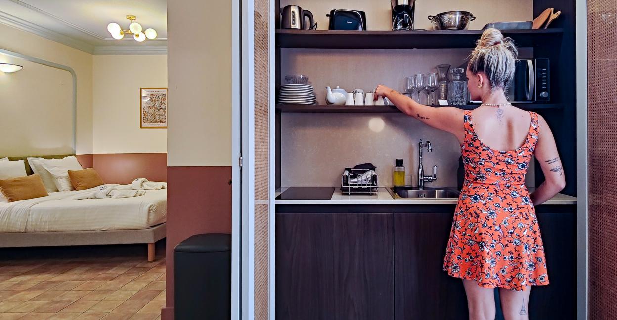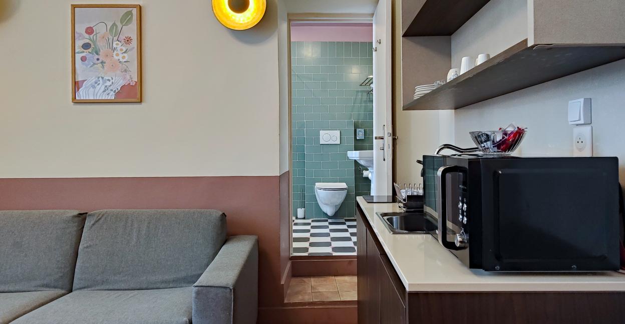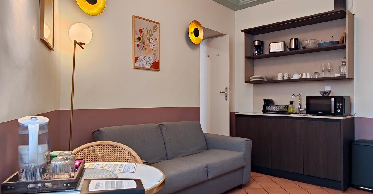 The ideal base to enjoy Nice! Enjoy a quality double bed (160/200 or 2*80/200), a kitchenette, a table and two chairs, smart TV and high speed wifi access, bathroom with shower. For your comfort, the apartment is over equippedwith the AMMI signature and perfectly soundproofed.