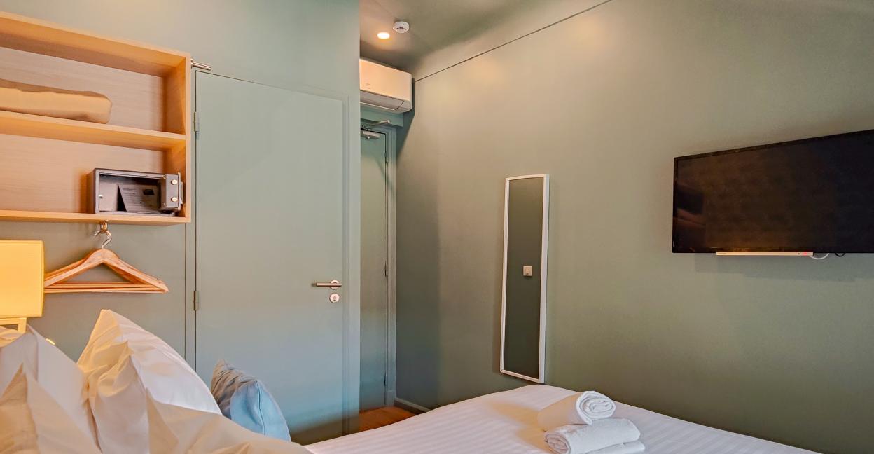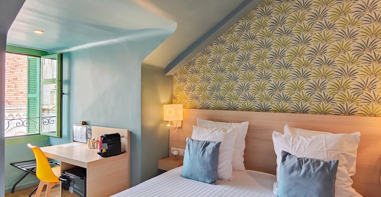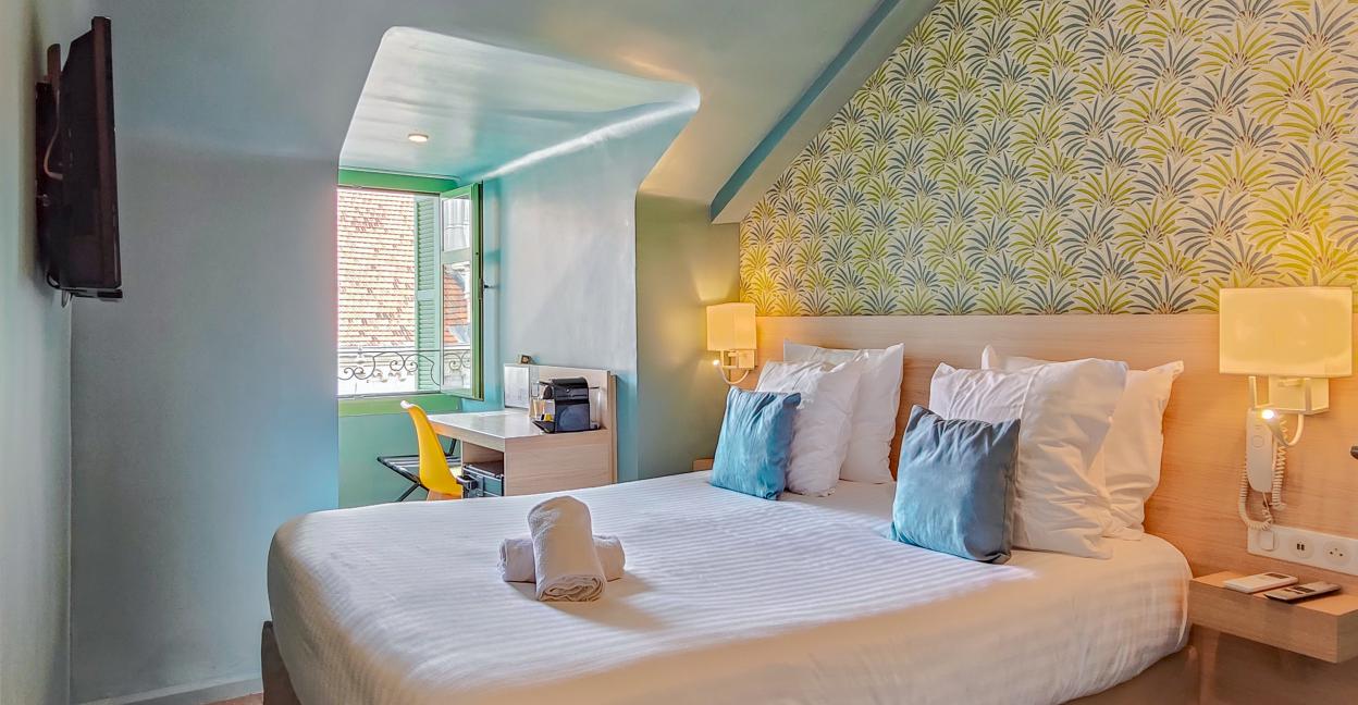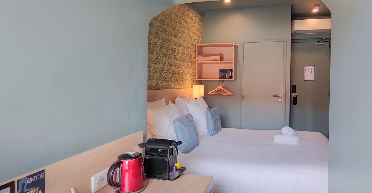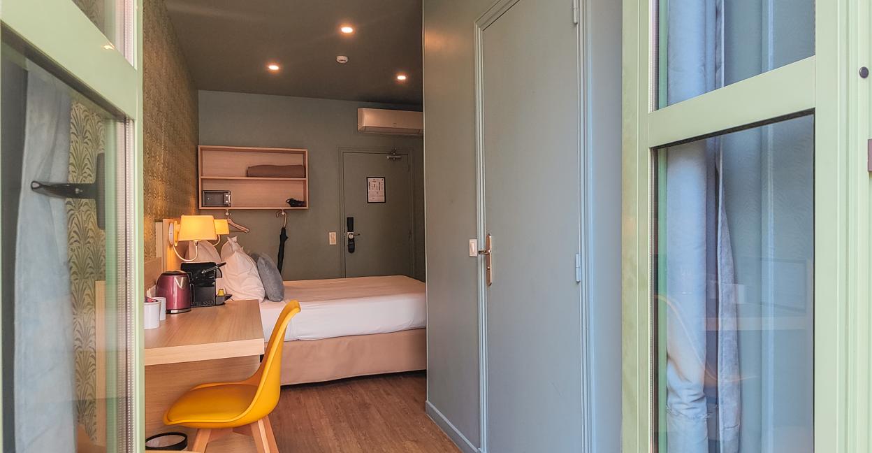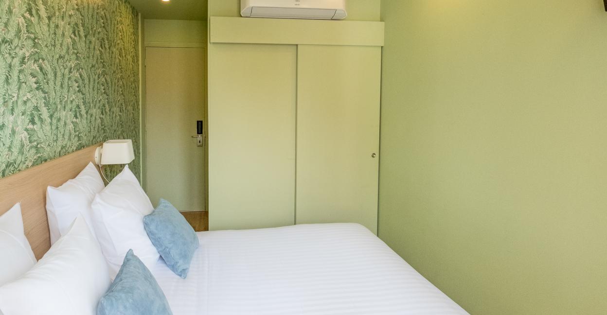Small room of 9 sqm (and bathroom of 2 sqm and small shower 70x70) with an excellent bed of 150x190, bed cover and 4 pillows. A small space which will be the ideal base to sleep well and then go out to discover the city of Nice and the French Riviera with an excellent quality/price ratio!