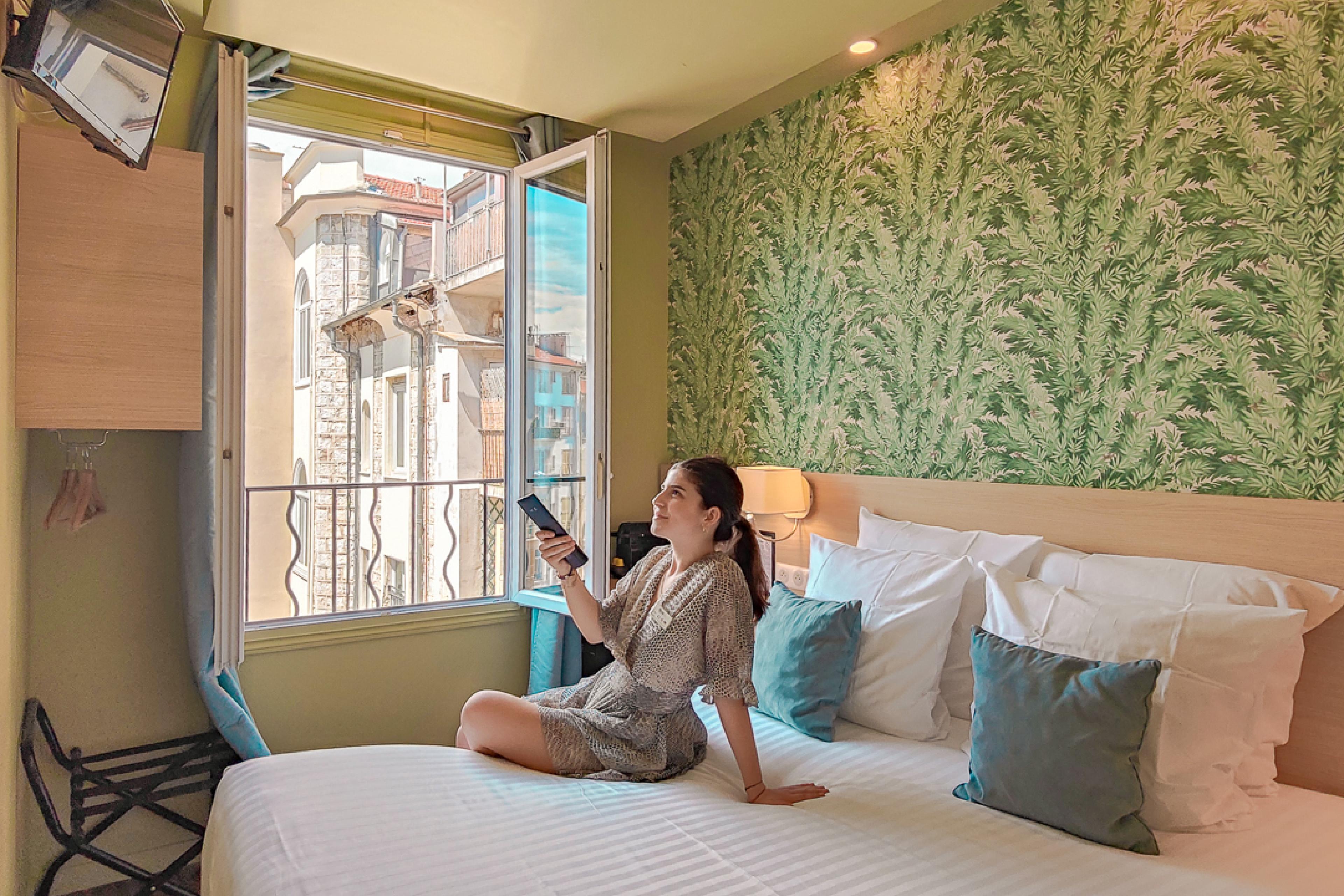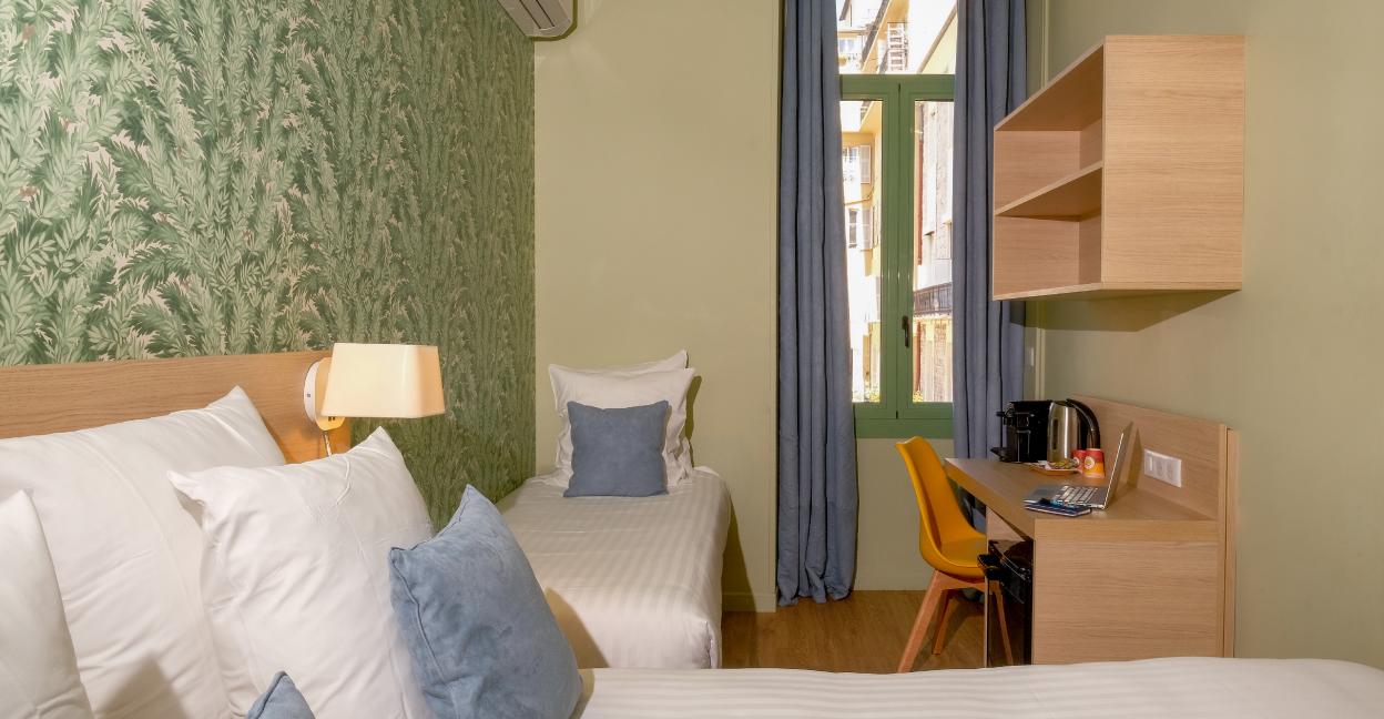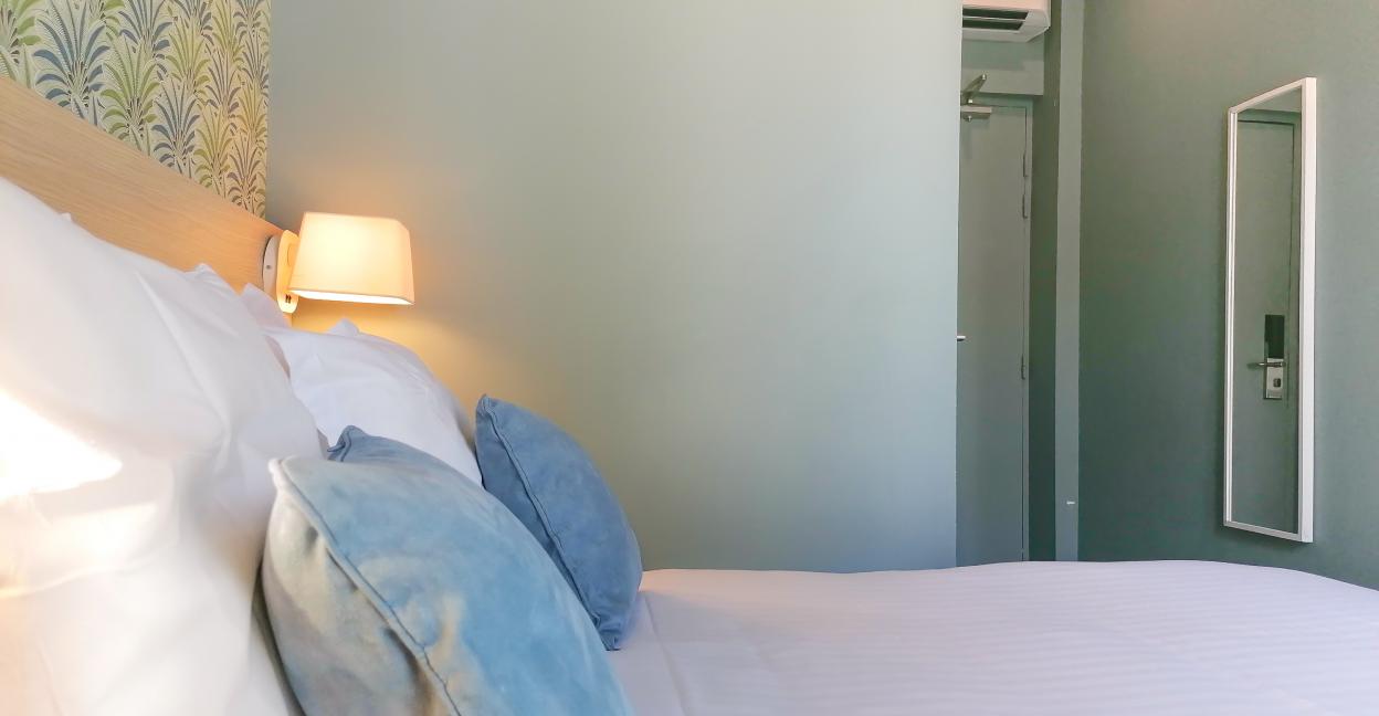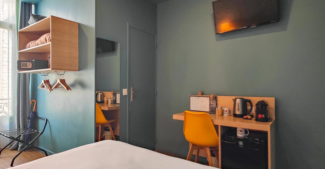 Petite chambre de 9 m² (et salle de bains de 2 m² et petite douche 70x70) avec un excellent lit de 150x190, couette et 4 oreillers. Un petit espace qui sera la base idéale pour bien dormir puis sortir découvrir la ville de Nice et la Côte d’Azur avec un excellent rapport qualité/prix !